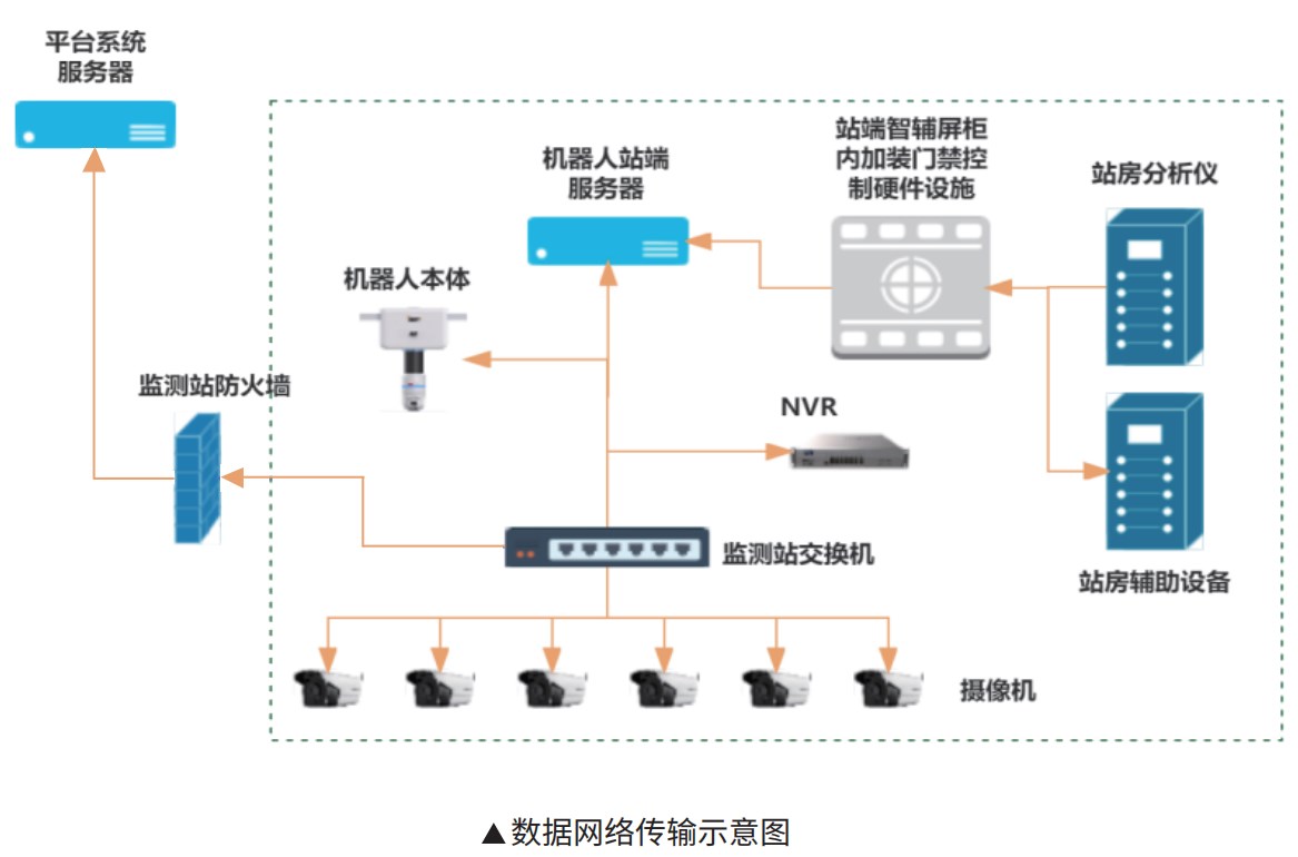 數(shù)據(jù)傳輸更是系統(tǒng)中的關(guān)鍵。運維機器人通過TCP協(xié)議接入站端服務(wù)器,站房分析儀和輔助設(shè)備數(shù)據(jù)實時上傳,而攝像機視頻數(shù)據(jù)通過交換機接入NVR,再傳送至站端服務(wù)器。站端服務(wù)器匯總站房監(jiān)測數(shù)據(jù),經(jīng)防火墻上傳至上級平臺系統(tǒng)服務(wù)器,確保數(shù)據(jù)傳輸?shù)陌踩€(wěn)定。